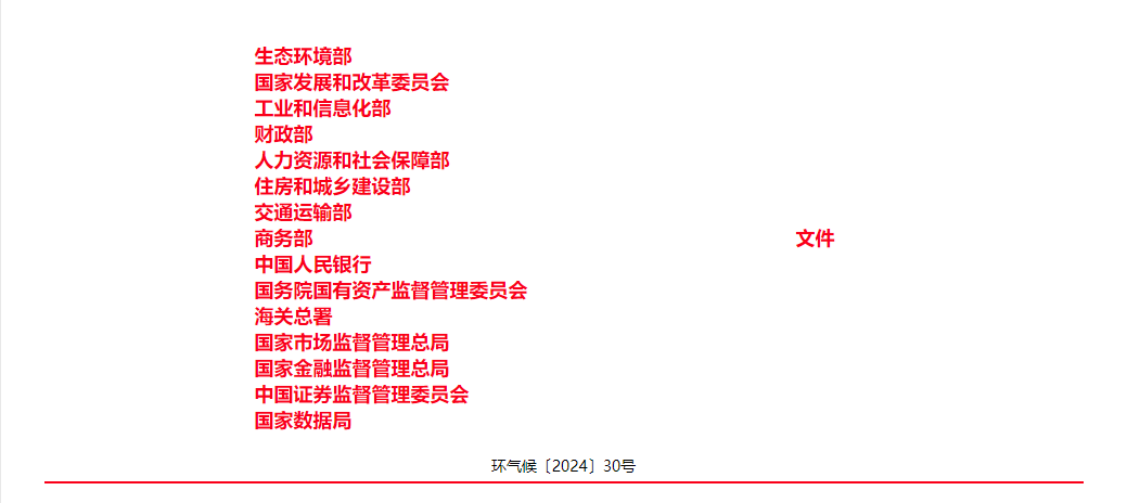 各省、自治区、直轄市及び新疆生産建設兵団生態環境庁 (局)、発展改革委員会、工業と情報化主管部門、財政庁 (局)、人力資源社会保障庁 (局)、住宅都市農村建設庁 (委員会、管理委員会、局)、交通運輸庁 (局、委員会) 、商務主管部門、国資委、市場監督管理局 (庁、委員会) 、データ管理部門。中国人民銀行上海本部、各省、自治区、直轄市及び計画単列市支店、税関総署広東分署、各直属税関、国家金融監督管理総局の各監督管理局。中国証券監督管理委員会の各証券監督局: